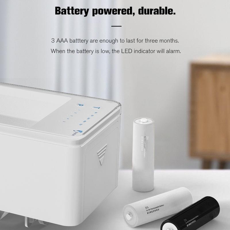- Batteridrevet med alarm for lavt batteriniveau: Drives af 3 AAA-batterier (medfølger ikke), der holder i op til tre måneder; har en LED-indikator, der advarer, når batteriet er lavt.