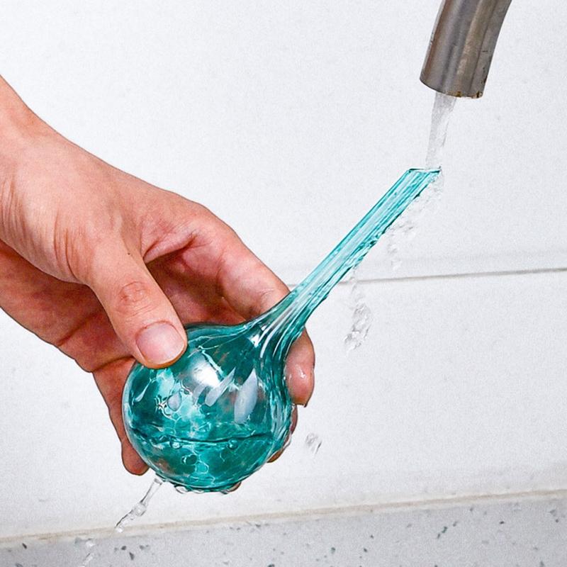 Hver vandingskugle er håndlavet af glas og kombinerer praktisk plantepleje med elegant dekoration. Den farverige finish giver et levende præg til urtepotter, plantekasser og havekrukker, samtidig med at den falder naturligt ind i ethvert hjem eller udendørs miljø.