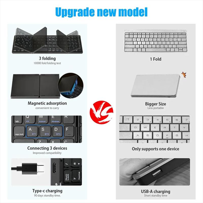 Trefoldede Bluetooth-tastaturer er populære, fordi de kombinerer bedre bærbarhed med en større skriveflade end mange kompakte minitastaturer. Modeller med numerisk tastatur er især nyttige til produktivitetsopgaver, da indtastning af tal kan foregå meget hurtigere og mere komfortabelt. Bluetooth-tastaturer til flere enheder bliver også stadig mere almindelige, da flere mennesker arbejder på tværs af telefoner, tablets og bærbare computere i løbet af samme dag. Sammenklappelige designs med magnetisk lukning hjælper med at beskytte tastaturet under transport og gør dem nemmere at have med i mindre tasker.