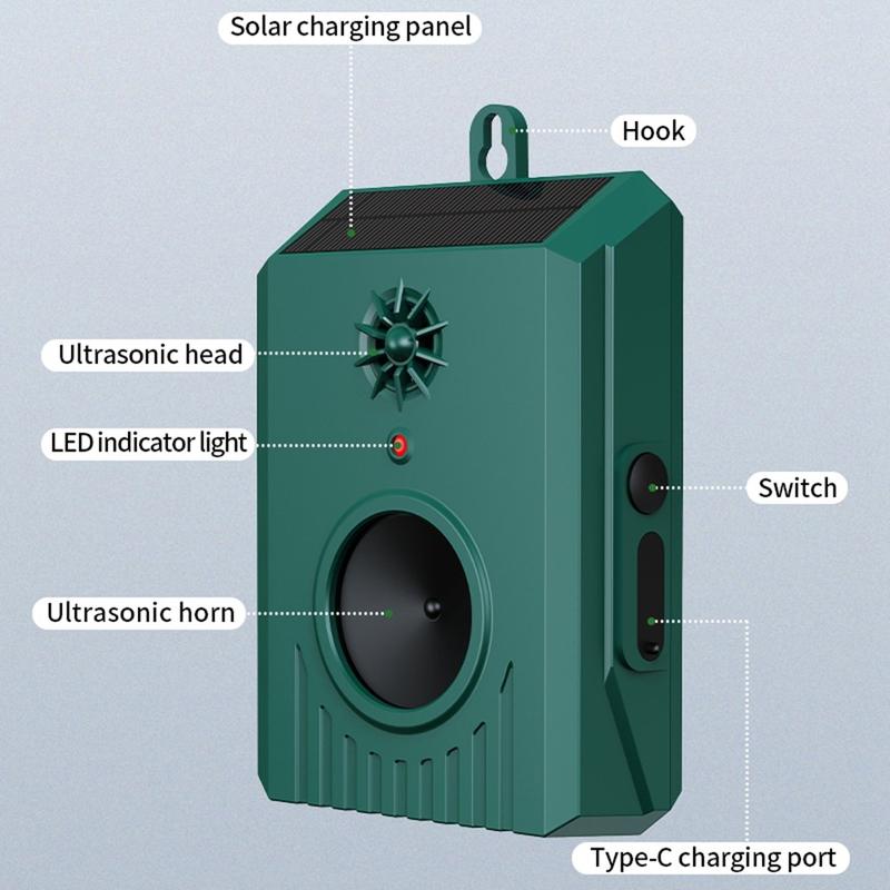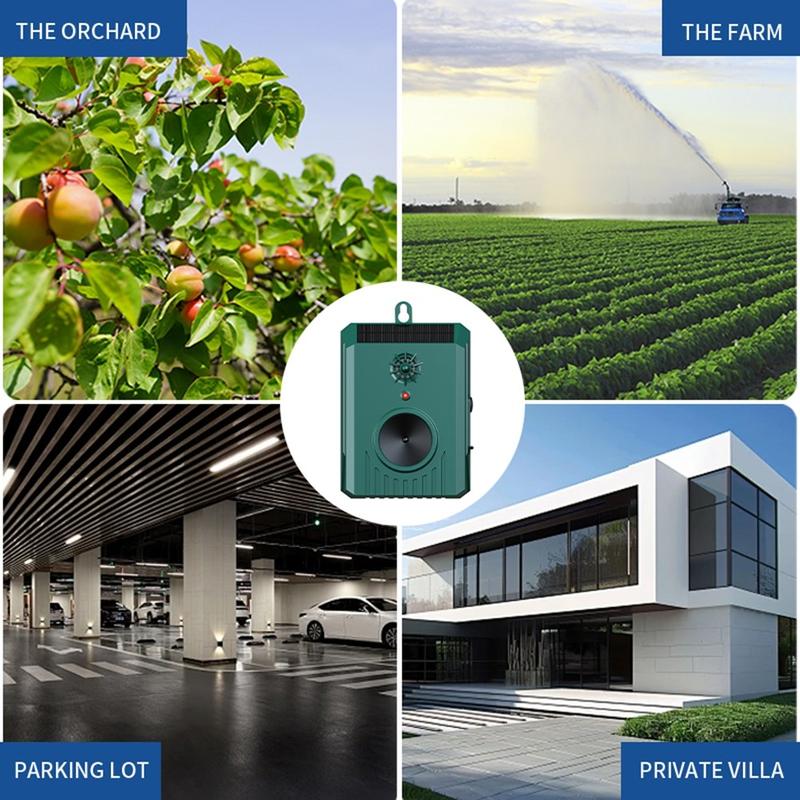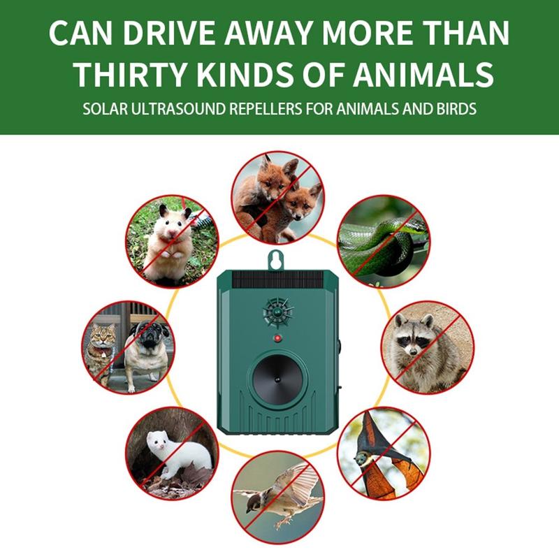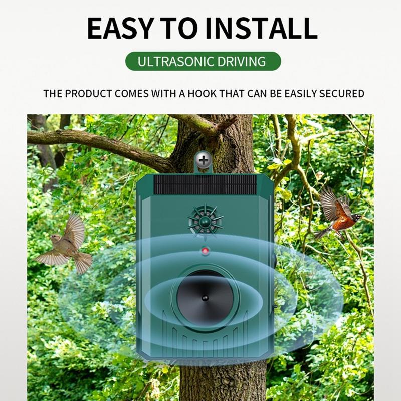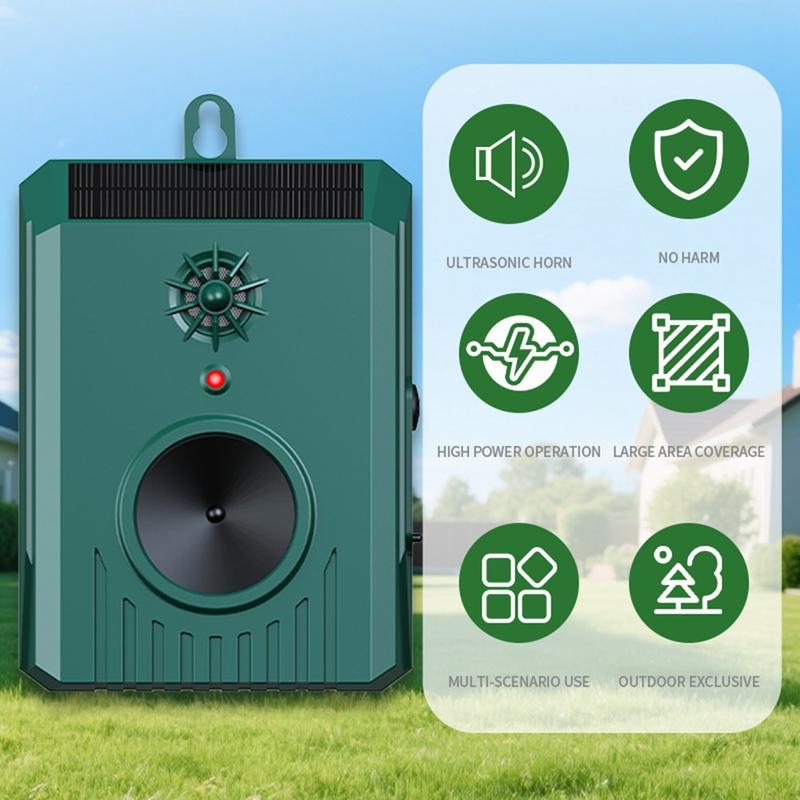 Ved at kombinere ultralydsbølger (8-35 kHz) med hørbar lyd afskrækker enheden effektivt fugle, gnavere, flagermus, hunde, egern og andre vilde dyr. Det dobbeltvirkende design øger den afvisende succesrate på tværs af en bredere vifte af skadedyr.