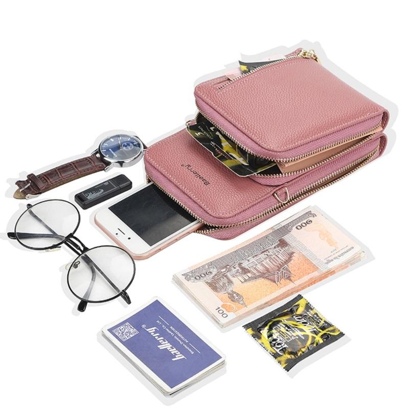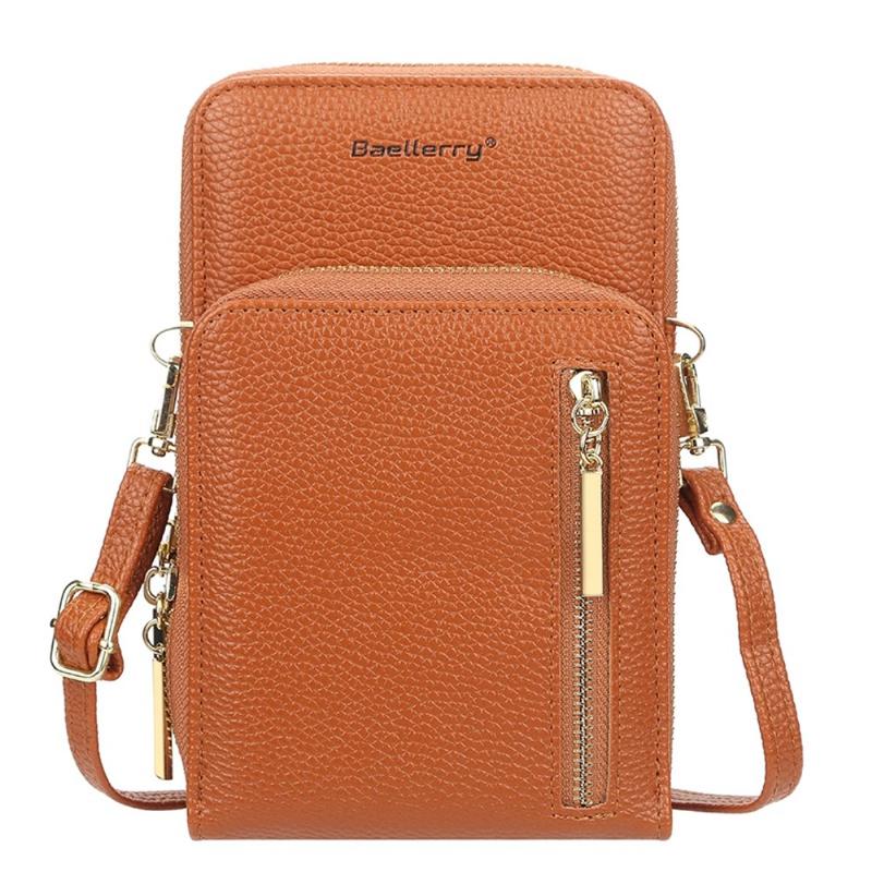 BAELLERRY N0110 Dobbeltlags lynlåspung i PU-læder med skulderrem til mobiltelefon til kvinder - brun