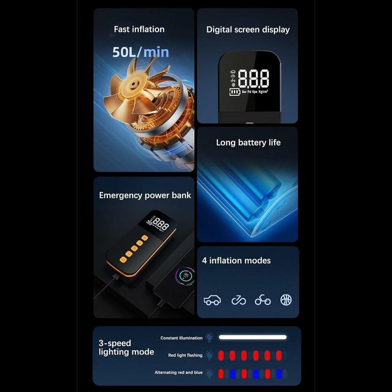 I modsætning til store, traditionelle luftkompressorer er denne trådløse, digitale pumpe let, bærbar og enkel at bruge. Dens smarte display, forudindstillede tilstande og kraftige oppumpningshastighed gør den til en praktisk følgesvend til sikker kørsel og en aktiv livsstil.