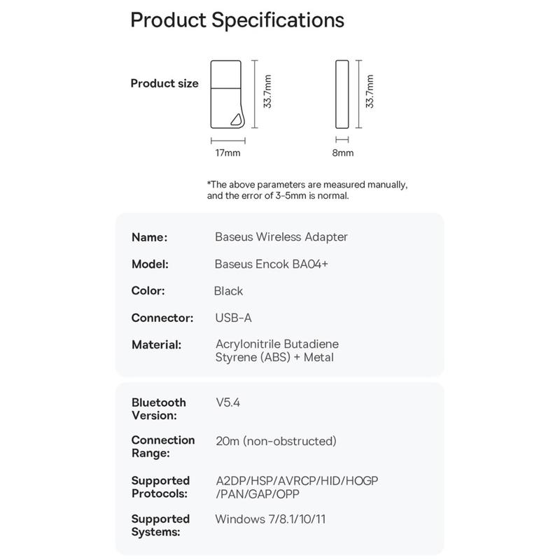 Opgrader din pc eller laptop med BASEUS Encok BA04+ USB Bluetooth-kompatibel adapter. Den trådløse rækkevidde på 20 m, omfattende protokolunderstøttelse og solide ABS+metalkonstruktion sikrer en stabil forbindelse af høj kvalitet til alle dine yndlingsenheder. Uanset om du har brug for at forbinde højttalere, tastaturer eller andre eksterne enheder, forenkler denne kompakte dongle din opsætning, samtidig med at du holder forbindelsen.