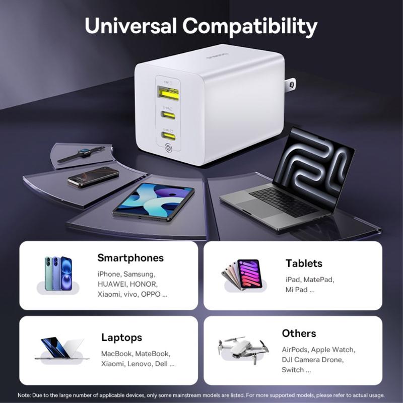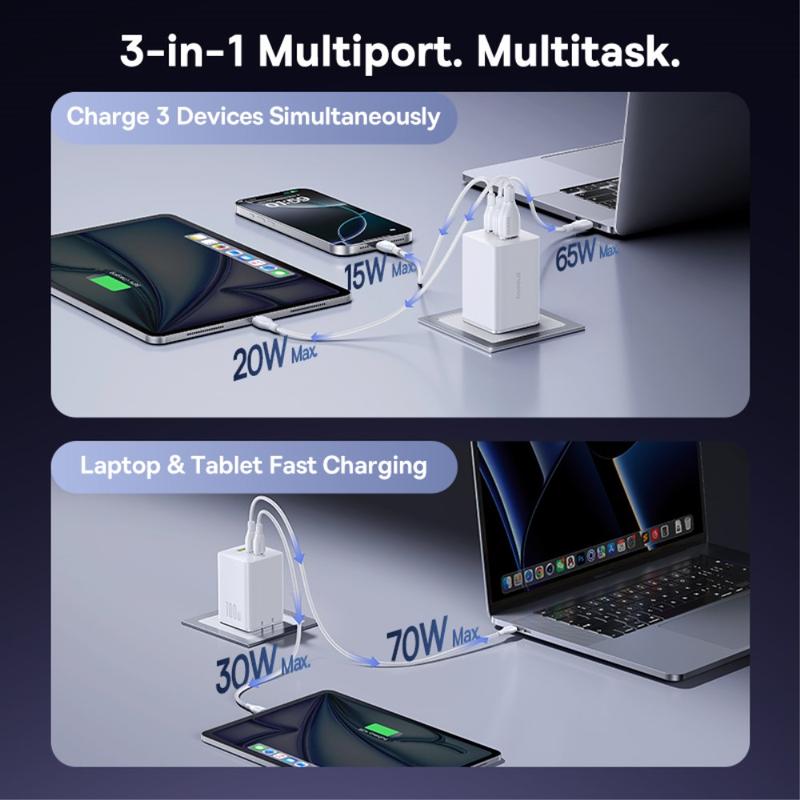 - Intelligent strømfordeling: 70 W + 30 W på dobbelt USB-C, eller 65 W + 20 W + 15 W på tværs af alle tre porte