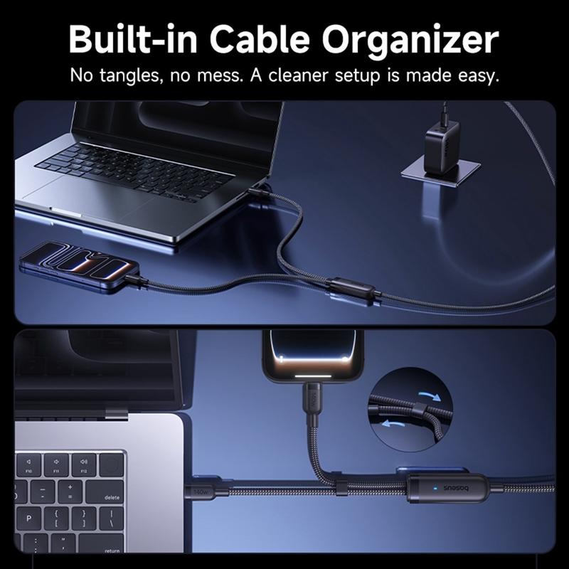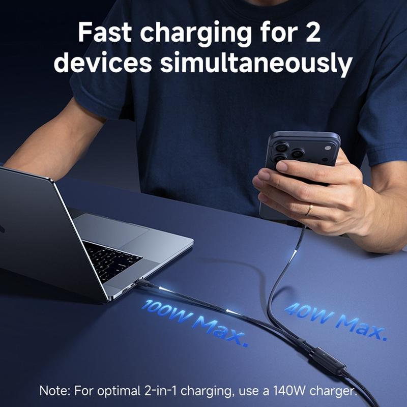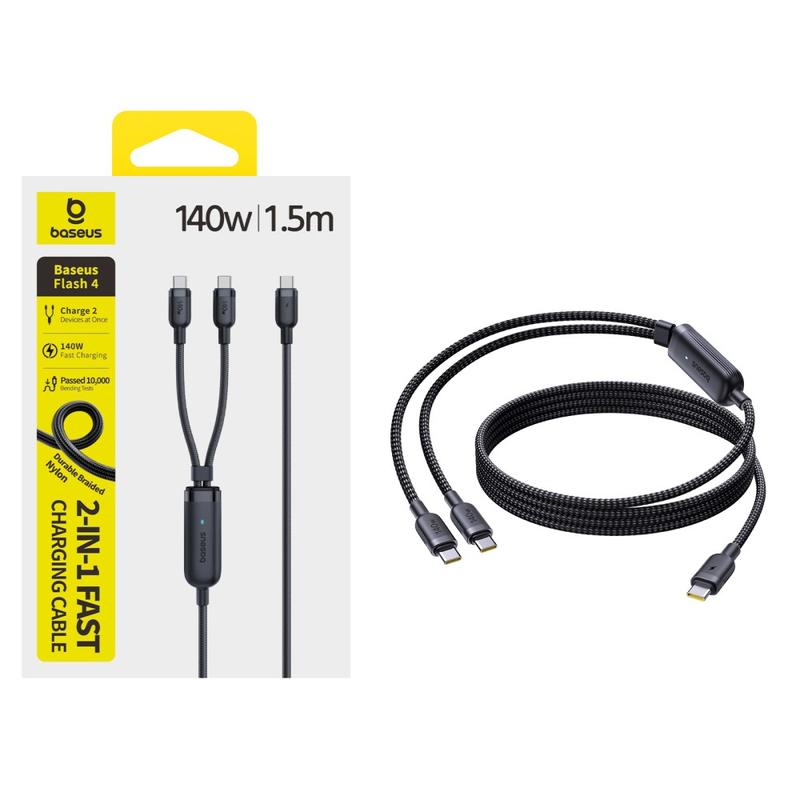 Oplad to enheder med ét kabel med BASEUS Flash 4 2-i-1-hurtigopladerkablet. Dette smarte opladerkabel er designet til moderne USB-C-enheder og kombinerer høj effekt, bred kompatibilitet og praktisk kabelhåndtering i én rejsevenlig løsning. Det understøtter op til 140 W ved opladning af en enkelt enhed og kan også intelligent fordele strømmen mellem to enheder på samme tid, hvilket gør det ideelt til bærbare computere, tablets, telefoner, håndholdte konsoller og meget mere.