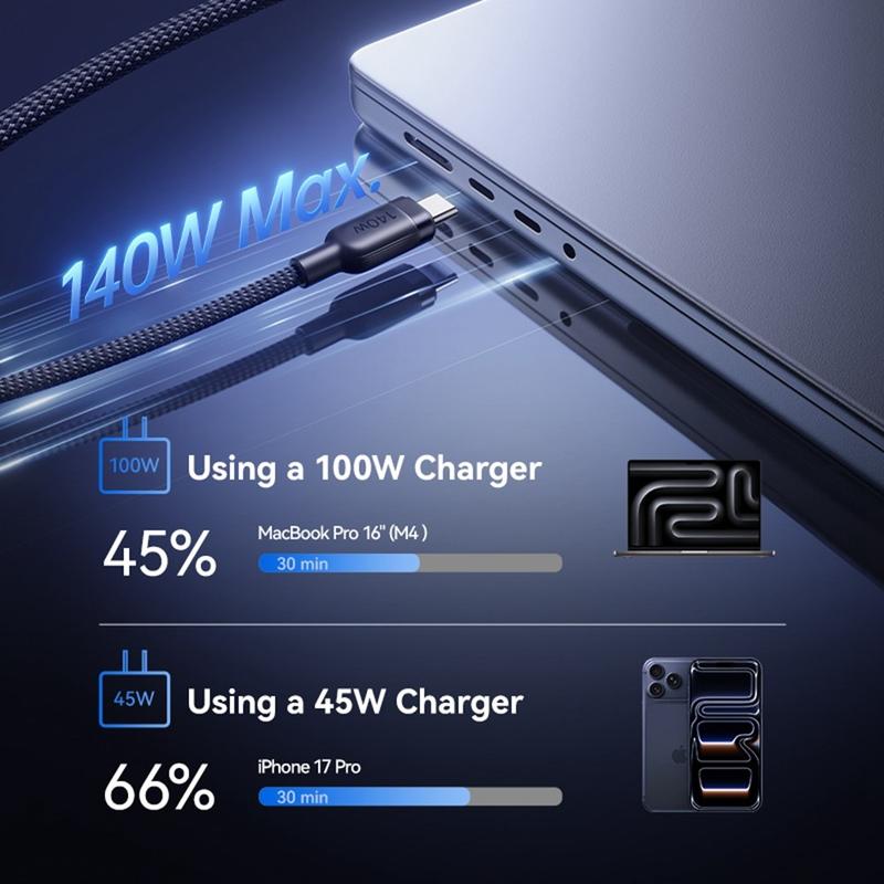 - 140 W USB-C-opladning er ofte forbundet med nyere standarder for opladning af bærbare computere med høj effekt under PD 3.1