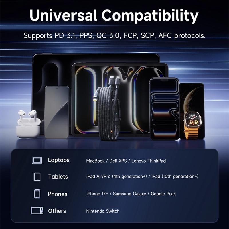 - Understøtter de vigtigste standarder for hurtigopladning, herunder PD 3.1, PPS, QC 3.0, FCP, SCP og AFC