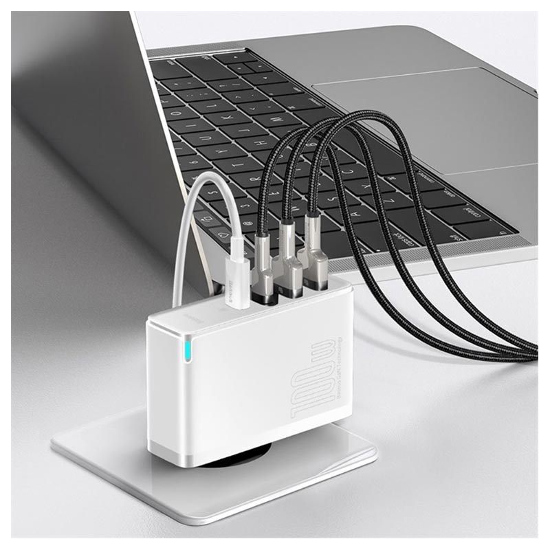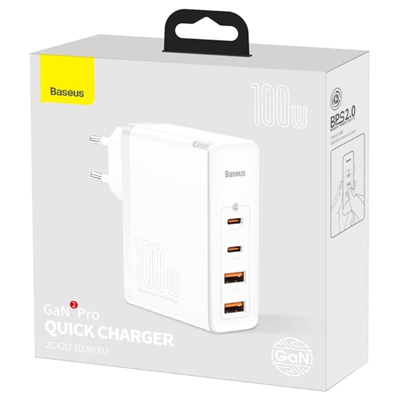 Brug denne Baseus GaN2 Pro multi-port hurtig oplader til hurtig strømforsyning af dine enheder med kun et stik. Utrolig 100W output effekt, to Type-C og to USB-porte, lader dig genoplade fire af dine enheder på samme tid hurtigere end nogensinde før. Den understøtter adskillige hurtig opladningsprotokoller gennem alle fire porte, opgraderet BPS 2 multi-port opladningsteknologi, overspænding, overstrøm, overopladning, beskyttelse mod kortslutning og BCT nedkølingssystem for sikker og pålidelig opladning.