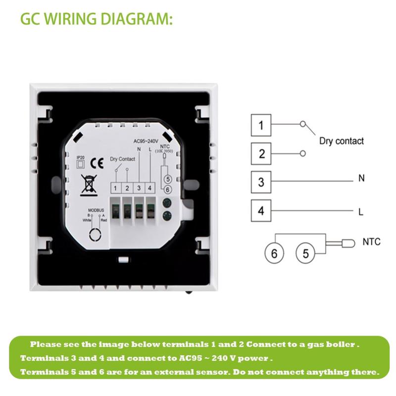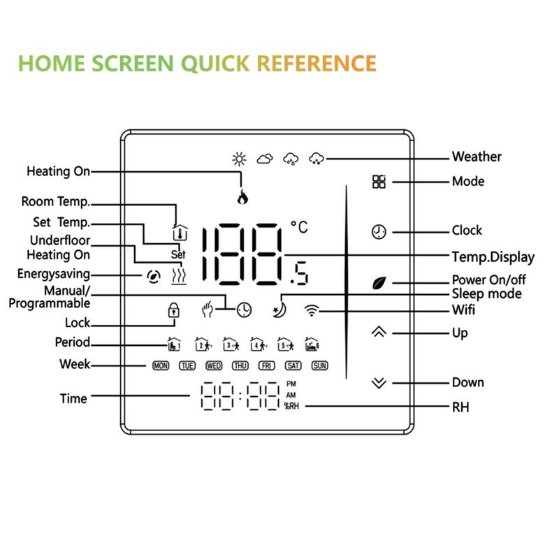 Denne termostat har en stilfuld rammeløs front med en 3,0-tommers LCD-skærm og en 2,5D buet kant, der giver et rent, moderne udseende. Skjulte kapacitive berøringsknapper bevarer det minimalistiske look, samtidig med at betjeningen forbliver enkel og intuitiv. Den flerfarvede LED-skærm gør det nemt at kontrollere indstillingerne og overvåge rumforholdene med et enkelt blik.