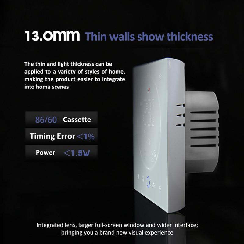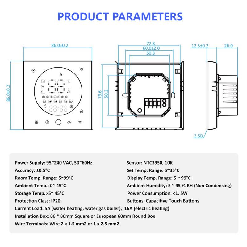 BHT-008GCL Smart Thermostat tilbyder en blanding af præcision, bekvemmelighed og moderne design, hvilket gør den til et fremragende valg for husejere, der ønsker at opgradere deres varmestyringssystemer. Dens kompatibilitet med et bredt spændingsområde og standard installationsbokse sikrer nem integration, mens den nøjagtige temperaturstyring bidrager til energibesparelser og forbedret komfort.