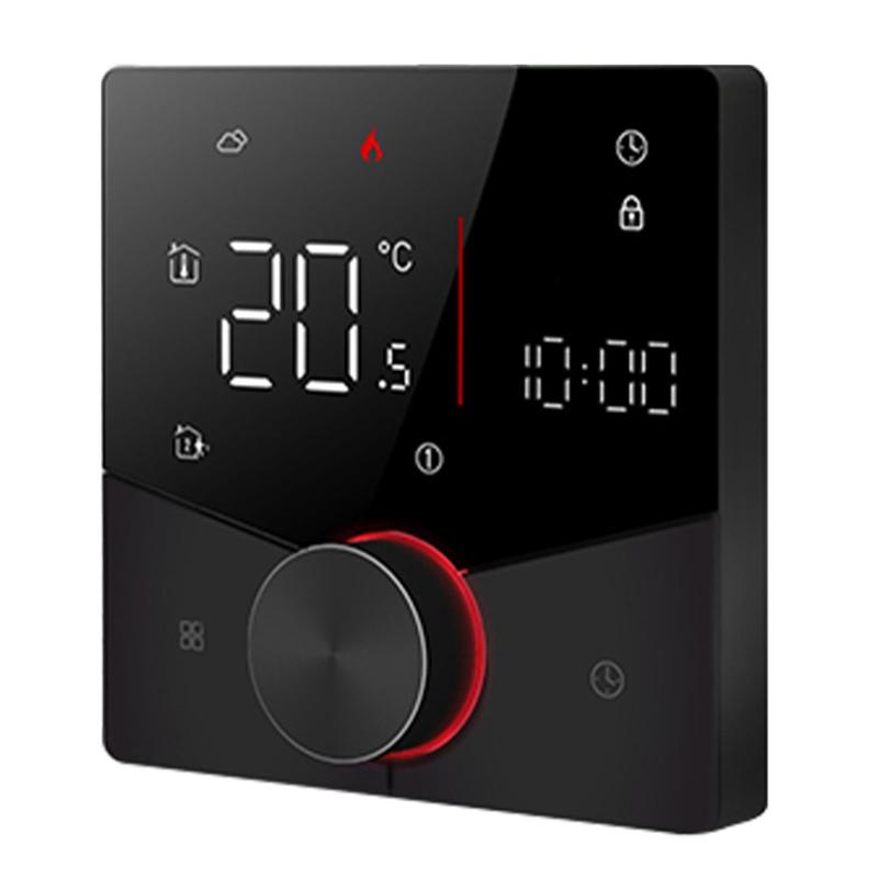 Denne termostat har et stilfuldt, ultratyndt indbygget panel, der passer perfekt ind i væggen og giver et rent og moderne udseende. Den rammeløse front med afrundede hjørner giver den et raffineret look, der nemt passer ind i forskellige indretningsstilarter. LED-skærmen giver tydelig visning af temperaturmålinger og indstillinger, mens de kapacitive berøringsknapper muliggør jævn og præcis betjening med et enkelt tryk.