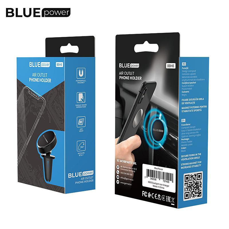Blue Power BBH6 Universal Magnetic Car Holder er den perfekte løsning til sikker montering af din telefon i bilen. Med en nem installationsproces er denne bilholder designet til at blive fastgjort til bilens ventilationsåbninger og kan bruges uden besvær. Grebet er lavet af gummi for at sikre, at det ikke beskadiger ventilationsåbningerne og giver en sikker base for din telefon. Der medfølger også to metalplader, som kan sættes fast på etuiet eller direkte på telefonen med klæbemiddel. Det gør det muligt at fastgøre telefonen magnetisk til holderen med et fast greb, så du kan orientere telefonen i enten stående eller liggende tilstand. På trods af det stærke greb er holderen lille og diskret og passer perfekt ind i selv de mest moderne biler.