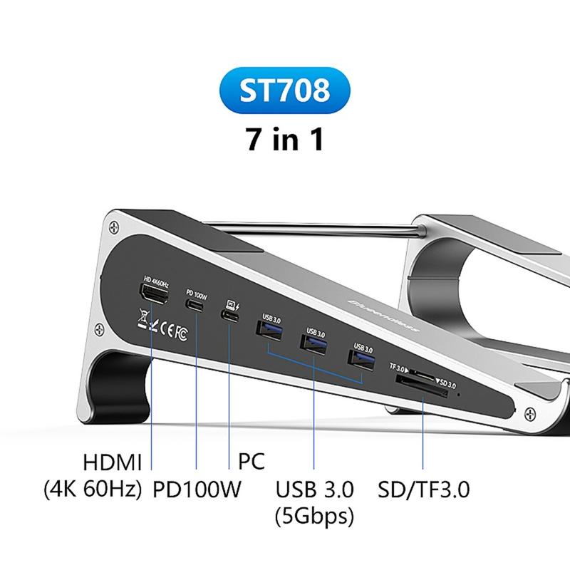 Blueendless ST708 7-i-1 bærbar computerstativ med USB-hub - 4K@60Hz HDMI, 100W PD-opladning, 3xUSB 3.0, TF-kortlæser, aluminiumsstativ til bærbar computer