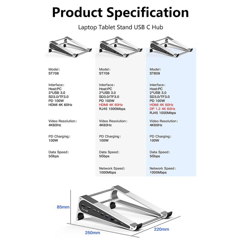 Med understøttelse af 4K@60Hz-videoudgang og 100W Power Delivery-pass-through-opladning holder ST708 din bærbare computer opladet, mens du udvider din skærm til en ekstern skærm. Strukturen i aluminiumslegering med rustfri stålstøtterør giver stabilitet og holdbarhed, hvilket gør den velegnet til hjemmekontorer, kreative arbejdsstationer og rejseopsætninger.