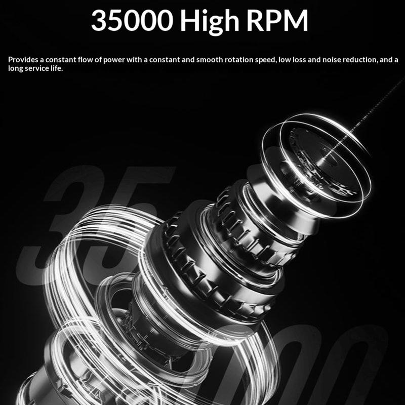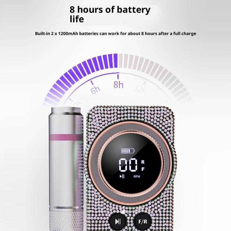 Med en højhastighedsmotor, der når op til 35.000 omdrejninger i minuttet, leverer den jævn og ensartet drift til formning, filning, finpudsning og generel neglepleje. LCD-displayet gør det nemt at overvåge hastighed, batteriniveau, rotationsretning og pausestatus, mens quick-lock-håndtaget muliggør nem udskiftning af bor uden ekstra værktøj. Det genopladelige batteri understøtter op til 8 timers brug, hvilket gør den praktisk til længere sessioner derhjemme, i saloner eller på farten.