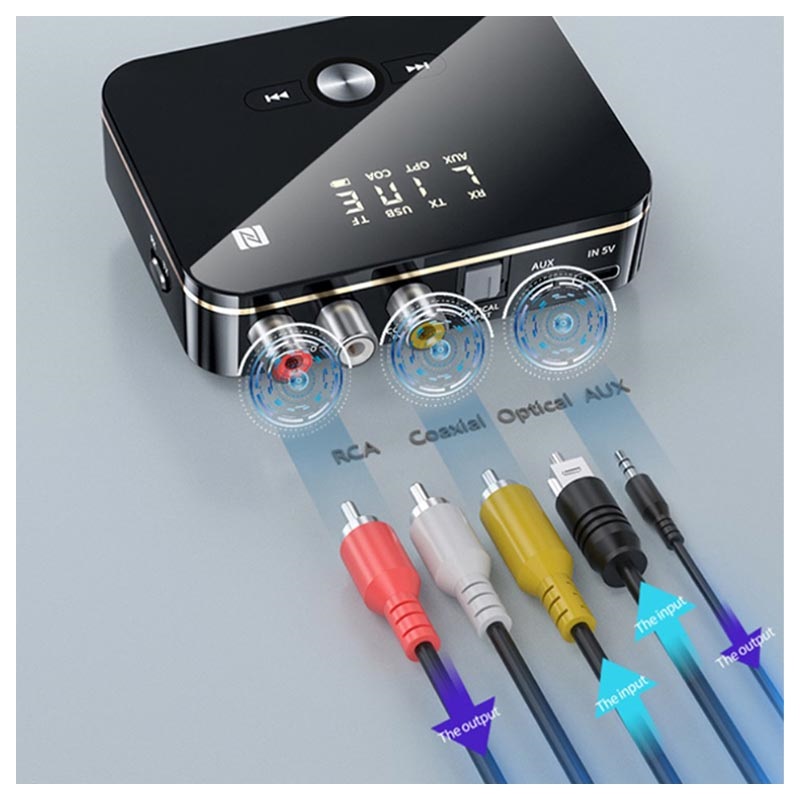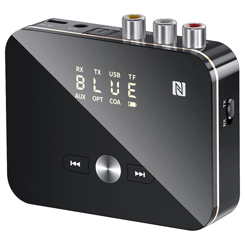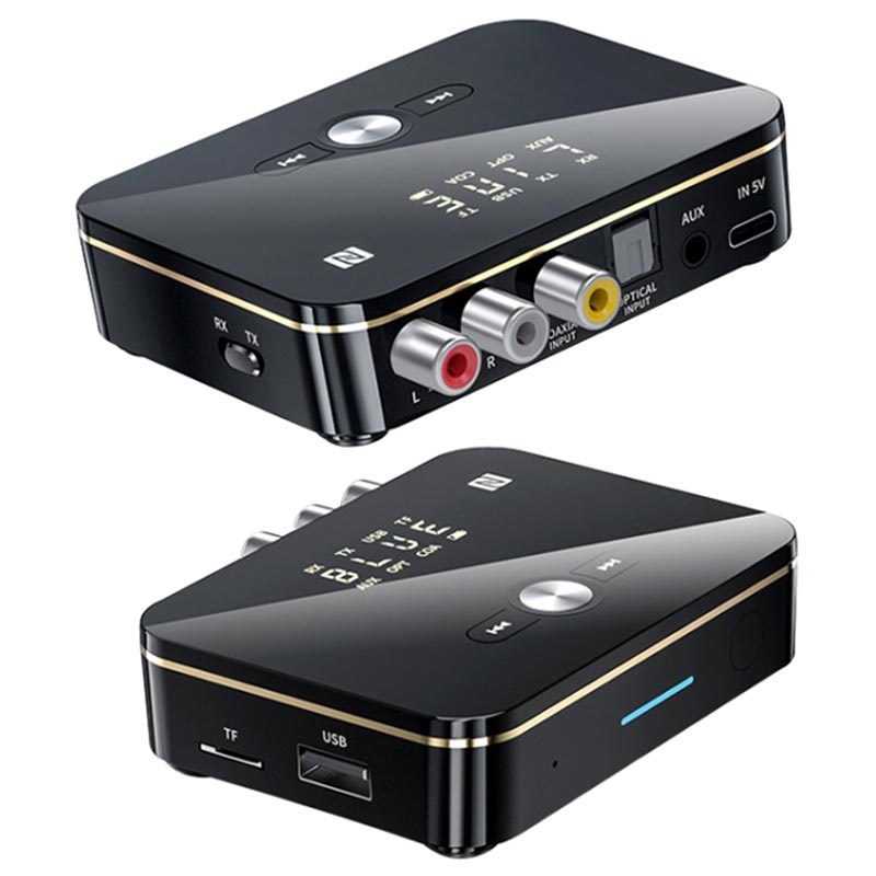 Brug M8 Bluetooth 5.0-transmitteren/modtageren til bekvemt at forbinde din smartphone, bærbare, tv eller projektor med dine trådløse højttalere eller hovedtelefoner. Den har 3,5 mm AUX, RCA, koaksial, optisk fiber, USB-port, slot til TF-kort for ultrabred kompatibilitet, mens dens NFC-understøttelse tillader parring med din smartphone eller tablet på kun to sekunder. Denne 2-i-1