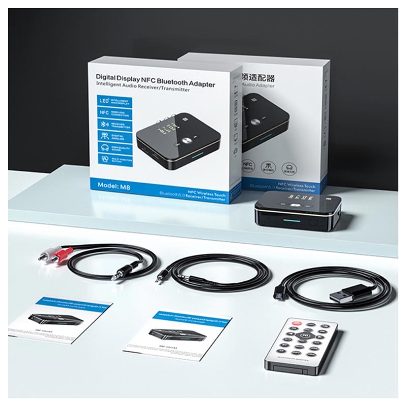 Bluetooth 5.0 Audio Sender / Modtager med Fjernbetjening M8 - AUX, RCA, Koaksial, Optisk, USB, TF-kort, NFC, 500mAh