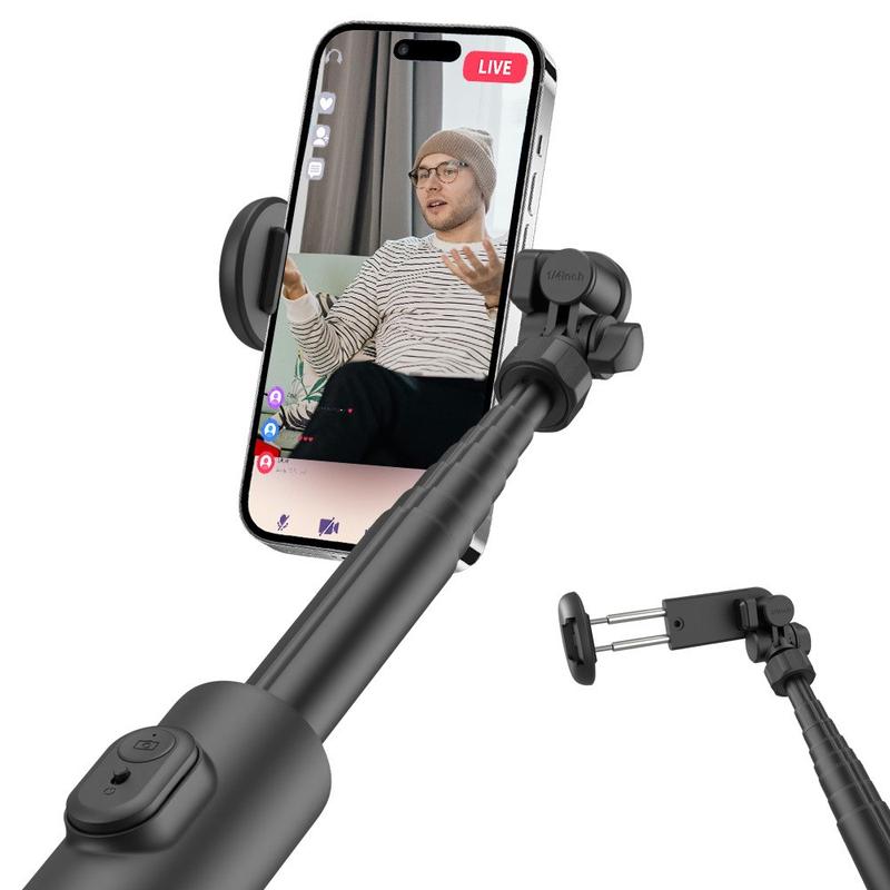 De fleste selfiesticks når ikke længere end en meter eller vakler, når de er fuldt udstrakte; T02 har ægte stativstabilitet, en bæreevne på 3 kg og en rejseklar vægt på 0,34 kg. Alt-i-et-design betyder, at der ikke er nogen ekstra telefonklemme eller fjernbetjening at miste - bare fold ud, par og tag billeder.