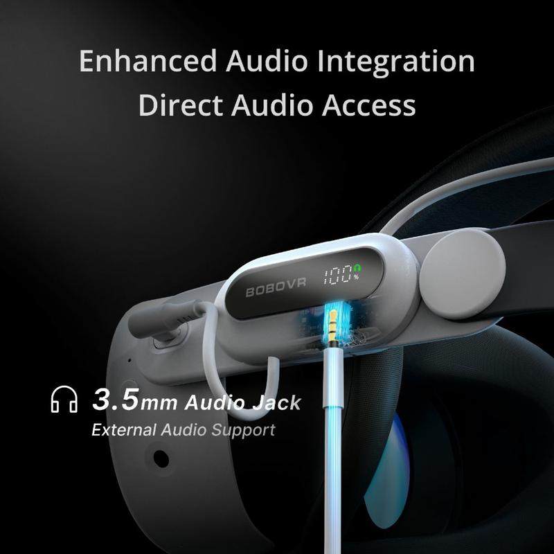 Løft din Meta Quest 3/3S-oplevelse med BOBOVR E3 Pro Head Strap, der kombinerer forlænget batterilevetid, overlegen komfort og alsidig lydtilslutning til et uovertruffent virtual reality-eventyr.