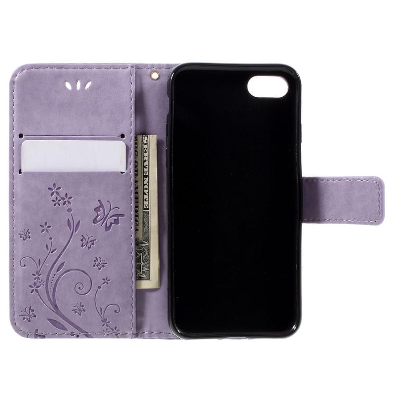 Imprint Butterfly Flower Stand Leather Wallet Cover til iPhone 7 er den perfekte kombination af stil og funktionalitet. Dette cover er designet til at beskytte din iPhone 7, samtidig med at det tilføjer et strejf af elegance med sit smukke sommerfugl- og blomsterdesign. Det er lavet af højkvalitets PU-læder, som sikrer langvarig beskyttelse og holdbarhed.