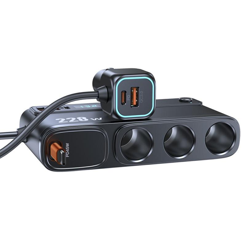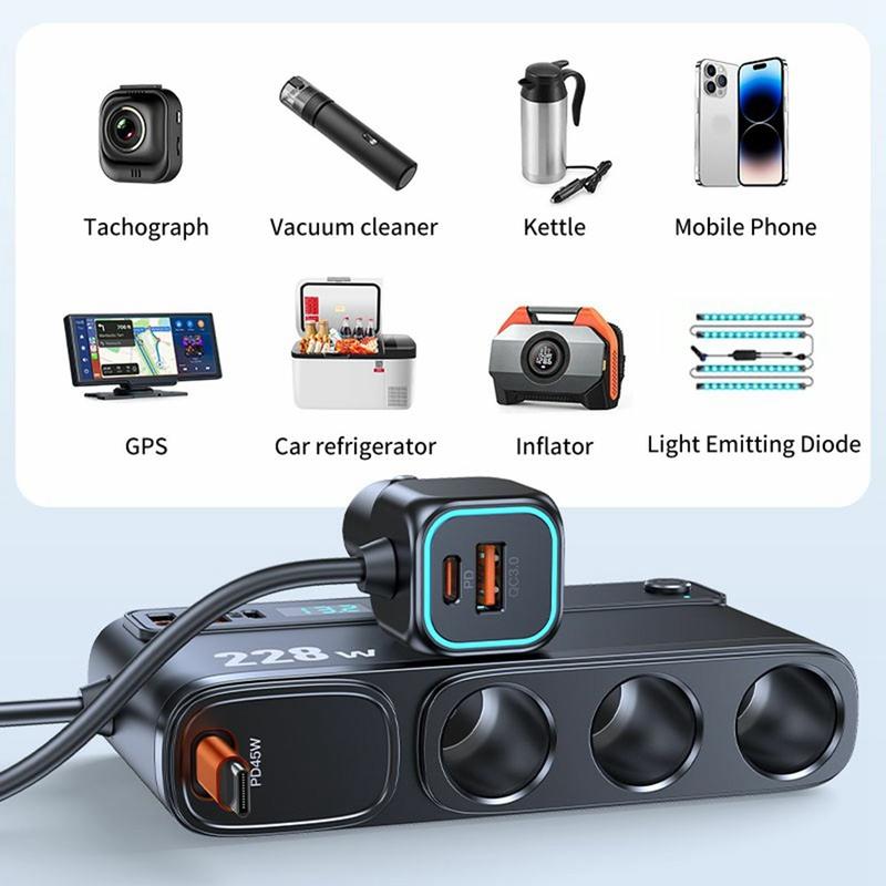 C35L 3-i-1 hurtigopladende billader med udtrækkeligt kabel og spændingsvisning - 228W multiport cigarettænderadapter