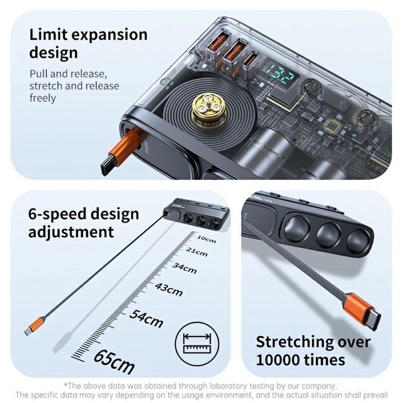 - Udtrækkeligt Type-C-kabel - Det indbyggede kabel kan forlænges fra 65 cm til 100 cm for fleksibel opladning.