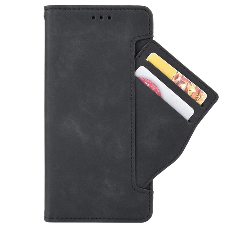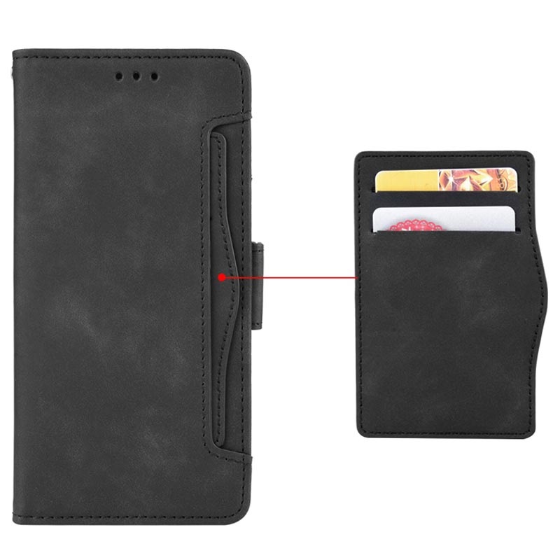 - Opbevaringsrum til kort og kontanter på indersiden og ydersiden, en lomme til et billede og en stativ-funktion