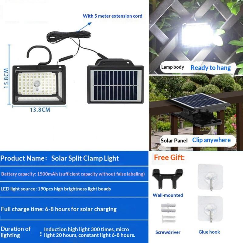 CCP087 190 LED-solcellelampe med bevægelsessensor er en IP65-vandtæt split-udendørslampe med lysstærk fem-sidet belysning, PIR-bevægelsesdetektering, opladning via solcellepanel og Type-C-backup-opladning. Den er ideel til haver, garager, altaner, gangstier og camping og tilbyder fleksibel installation og praktisk, energibesparende udendørsbelysning.