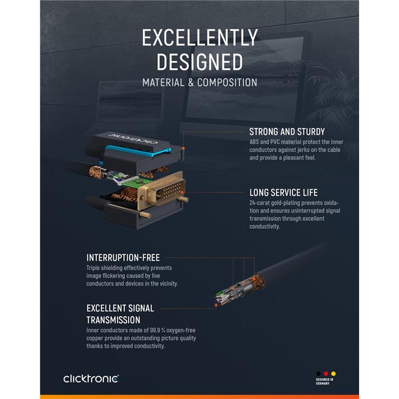DVI-D- til HDMI™-kabel er ideel til at tilslutte, monitor til vedligeholdelsesmedier, f.eks. speldatorer, spillekonsoller eller Blu-Ray-afspiller. Overför digitala lyd- og videosignaler i begge retninger, t.ex. fra spildator til monitor, UHD-signaloverførsel med WQXGA @ 60 Hz (1600p) og Full HD @ 60 Hz (1080p), HDMI™-tilslutningskabel med maksimal overførselshastighed på op til 4,95 Gbit/s, 24 karat guldpläterede HDMI™-kontakter og avanceret teknik garanterer fejlfri signalkvalitet uden billedoverføringsydelser for en optimal vedligeholdelsesoplevelse. 2-faldig skærmning og indre leder af 99,9 % syrefri koppar for kristallklart lyd og knivskarp video- og billedkvalitet, fleksibel beskyttelse og robust PVC-kabelhölje gør at anslutningskabeln kan undgås med skader.