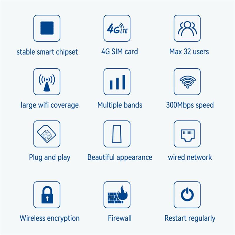 Konverter dit 4G-signal til et Wi-Fi-hotspot med en rækkevidde på 20-30 meter. Routeren understøtter op til 32 enheder samtidigt, hvilket gør den ideel til husholdninger, små kontorer og fællesrum.