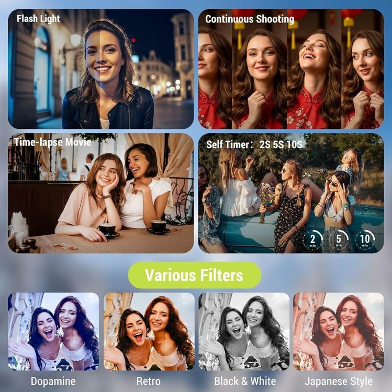 Drejelige skærme er en nøglefunktion for vloggere, da de giver mulighed for præcis indramning uden eksterne skærme. Digital zoom kombineret med sensorer med høj opløsning hjælper med at bevare klarheden, når man optager på afstand. Kompakte kameraer som CV21 er stadig populære, fordi de tilbyder dedikeret kontrol og stabil videokvalitet uden udelukkende at være afhængige af smartphones.