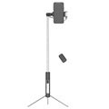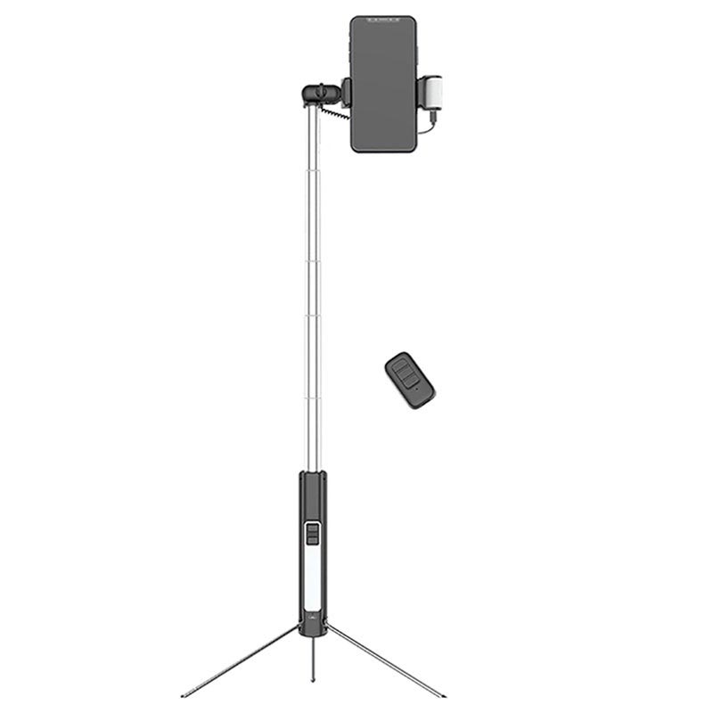 - Multifunktionel selfiestang med tripod, LED lys og aftagelig kameralukker