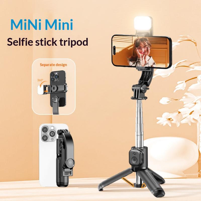 - Selfie-stick, mini-stativ og fill light i én enhed