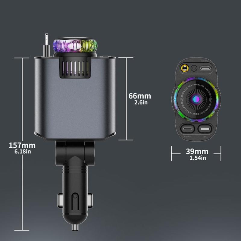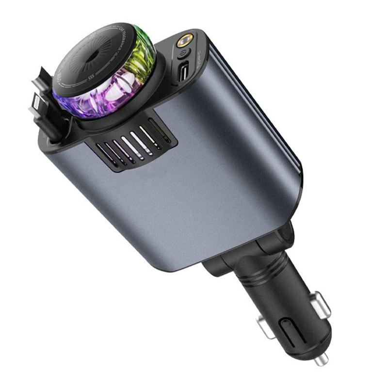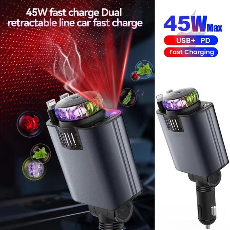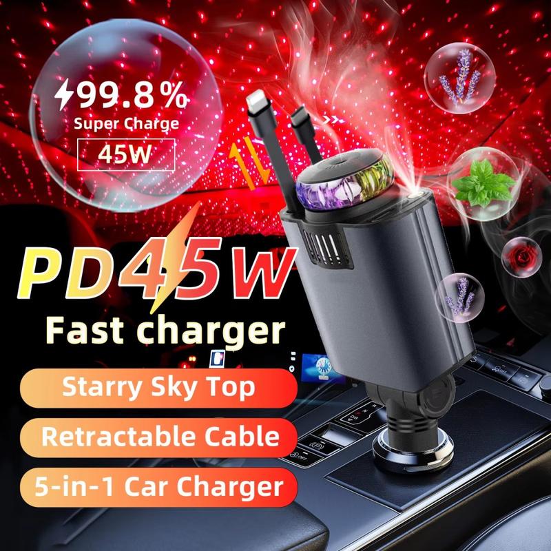 D1 5-i-1 45W PD & QC biloplader med stjernelys-projektor, aromaterapi-diffusor og udtrækkelige USB-C / Lightning-kabler