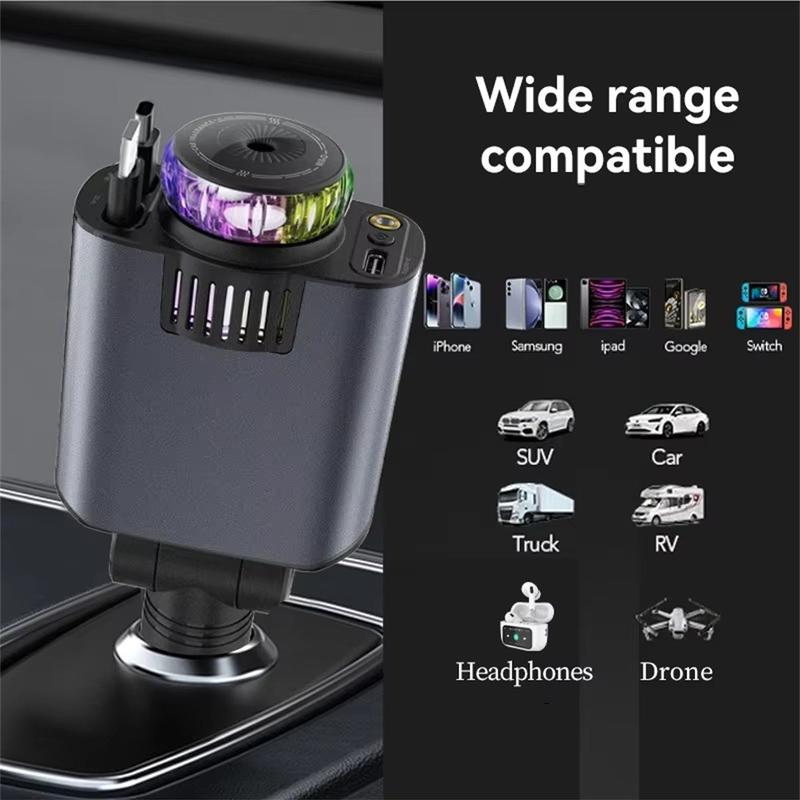 - 5-i-1 alsidighed - hurtigoplader, magnetisk stjernelys-projektor, vandfri aromaterapi-diffusor, to udtrækkelige kabler og voltmeter til batterisundhed i én kompakt enhed.