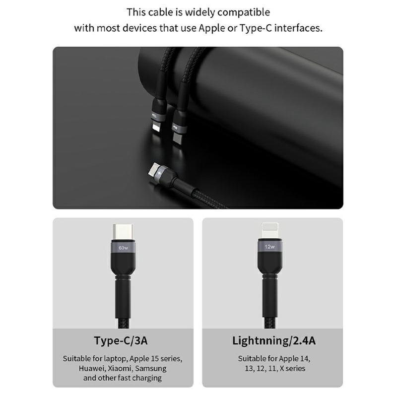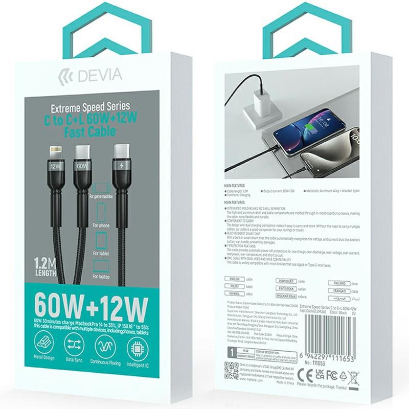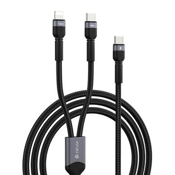 Devia EC648 Extreme Speed 2-i-1 USB-C-kabel - USB-C til USB-C 60 W PD og Lightning 12 W, flettet nylon, datasynkronisering, 1.2m