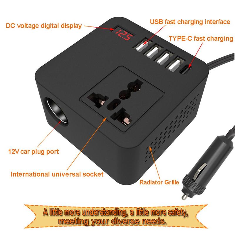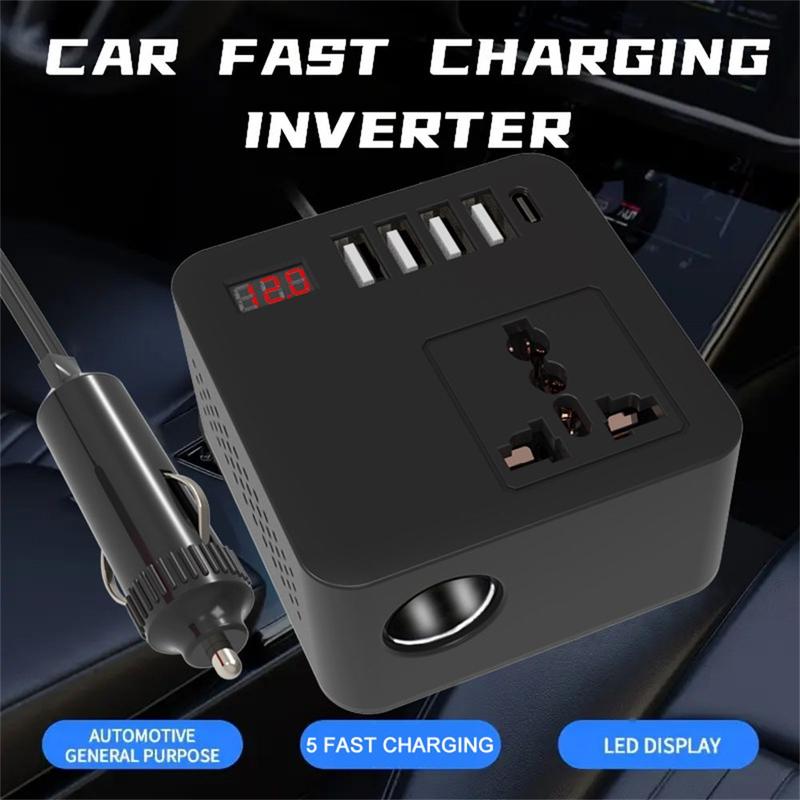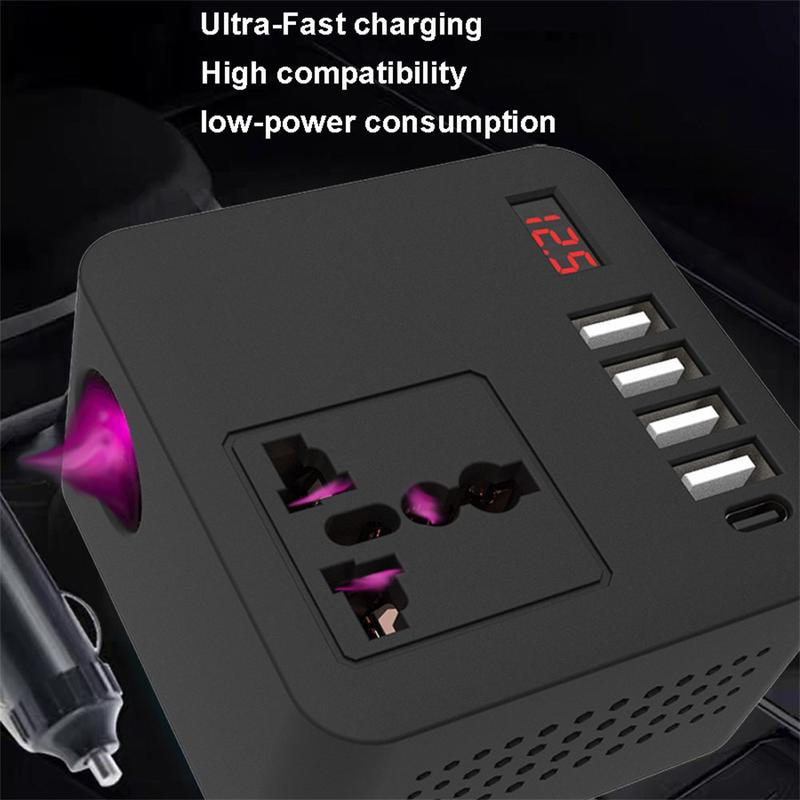 Få strøm til dine enheder, når du er på farten, med Digital Display Car Power Inverter, en kompakt, men kraftfuld omformer, der omdanner bilens 12 eller 24 V jævnstrøm til 110 eller 220 V vekselstrøm. Den er designet med flere hurtigopladningsporte, intelligent køling og fuld sikkerhedsbeskyttelse og er perfekt til rejser, camping og nødstilfælde.