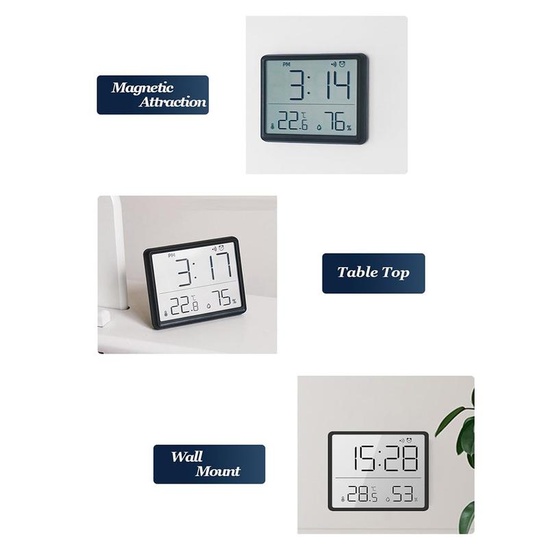 - Stort LCD-display: Giver klare og letlæselige oplysninger, der viser tid, dato, temperatur og luftfugtighed på et øjeblik.