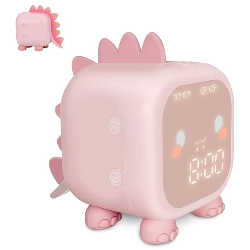 Giv dine børn et helt ideelt miljø at sove i med denne søde dinosaur natlampe og vækkeur. Det har to alarmfunktioner der kan udvikle gode opvågnings- og sovevaner. Snooze-funktionen aktiveres ved at klikke på den lille knap i toppen, hvilket vil give dig 5-minutters ekstra sovetid. Dette digitale vækkeur er udstyret med tilstandene solopgang og solnedgang, hvor lyset langsomt skifter fra mørkt til lyst, eller omvendt, for at gøre det nemmere at stå op om morgenen. Dit barn vil føle sig trygt i mørket, fordi du kan sætte en timer på lampen. Lyset slukker efter 60 minutter, hvilket bør være nok tid til at falde i søvn. Overrask børnene med denne søde dinosaur natlampe/vækkeur!