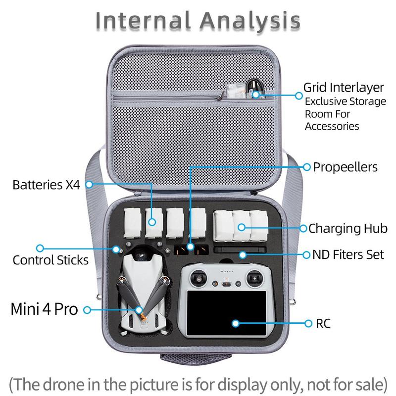 - Tilpasset design: Kufferten er skræddersyet specielt til DJI Mini 4 Pro og har præcise rum til sikker opbevaring af drone, fjernbetjening med skærm, tre batterier, opladningshub, oplader og andet mindre tilbehør.