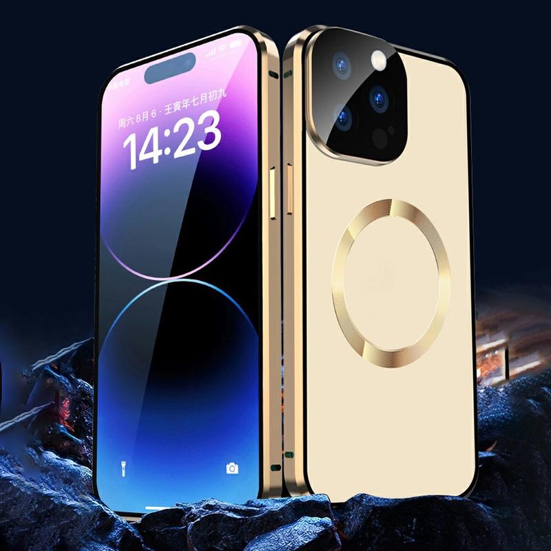 Kompatibel med MagSafe-etui til iPhone 15 Pro Magnetisk metalramme + dobbeltsidet telefoncover i hærdet glas med spændelås - Guld