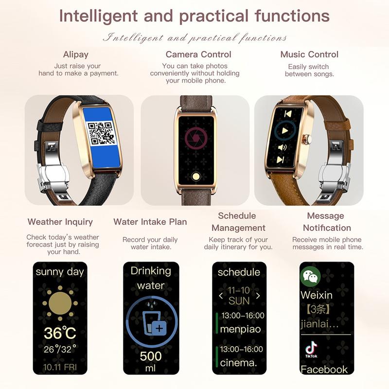 Hold dig organiseret og forbundet med en række smarte værktøjer: Alipay-understøttelse, musikstyring, fjernbetjent kamera, vibrationsalarmer, beskednotifikationer, vejropdateringer, påmindelser om væskeindtag og skemastyring. Den er designet specielt til kvinder og omfatter også sporing af menstruationscyklus og dæmpning af displayet i nattilstand for afslappende aftener.