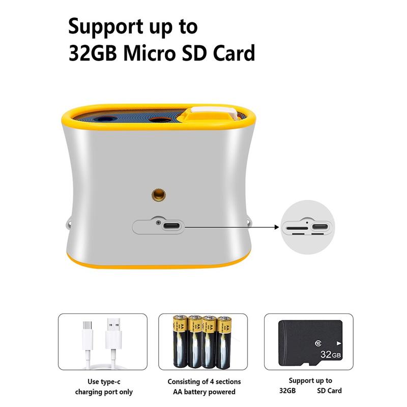 DT15 drives af 4 × AA-batterier eller Type-C-opladning, hvilket gør den praktisk til rejser og udendørs brug. Med sit lette design og den medfølgende snor kan børn bære den sikkert og komfortabelt. Lageret kan udvides med et 32 GB microSD-kort (medfølger ikke).