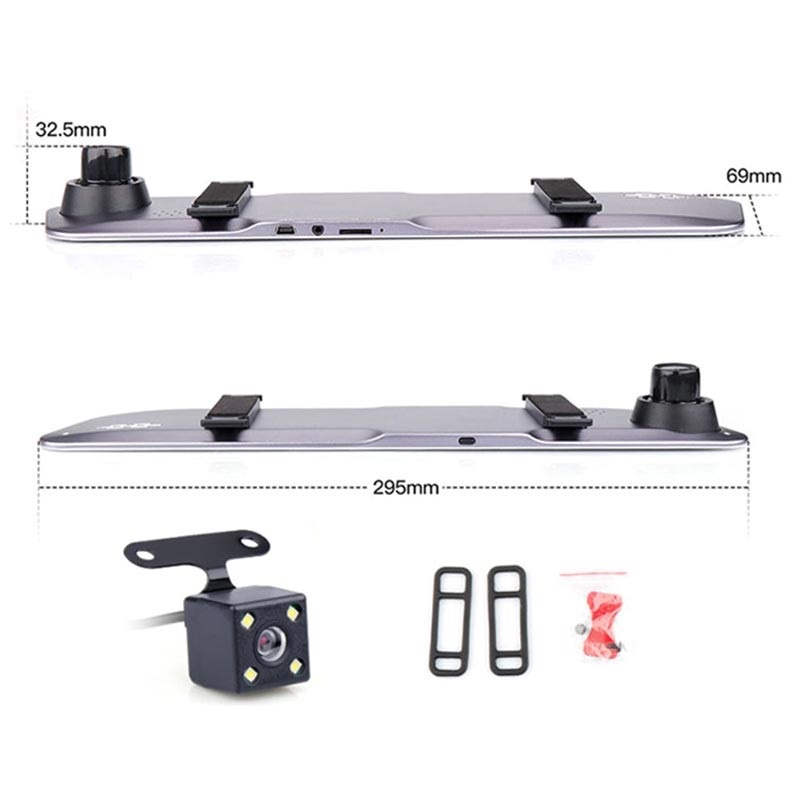 Det forreste instrumentbrætkamera har et spejlmonteret design, et 170-graders ultravidvinkelobjektiv, en 4,39" skærm og optager videoer i 1080p Full HD-opløsning. Bagkameraet har et 110-graders vidvinkelobjektiv og optager videoer i 720p HD-opløsning. Dette bilkamera med dobbelt linsespejl er udstyret med nattesyn og G-sensor.
