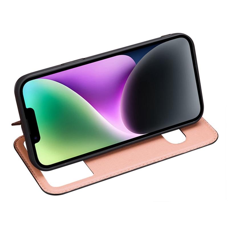 Stødsikkert etui til iPhone 14 Anti-drop telefoncover Dual Window ægte okselæder mobiltelefon etui med stativ