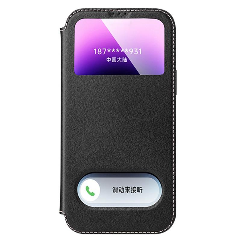 Stødsikkert etui til iPhone 14 Anti-drop telefoncover Dual Window ægte okselæder mobiltelefon etui med stativ