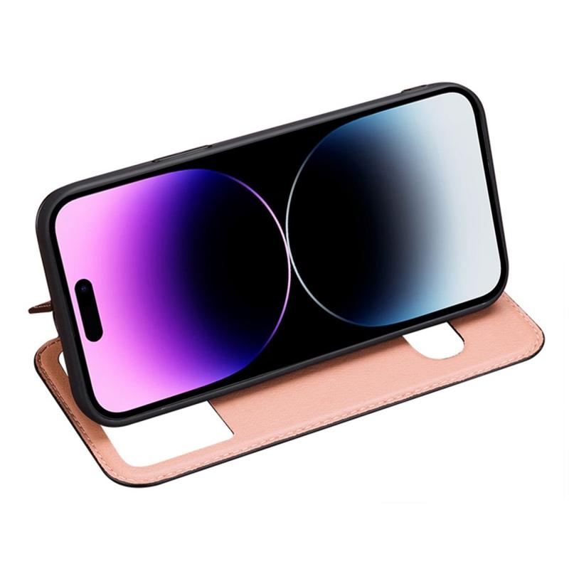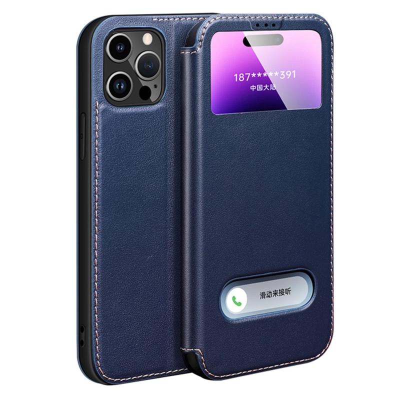 Ægte kohud læder etui til iPhone 14 Pro Max stødsikkert cover Dual Window Anti-Fald telefoncover med stativ