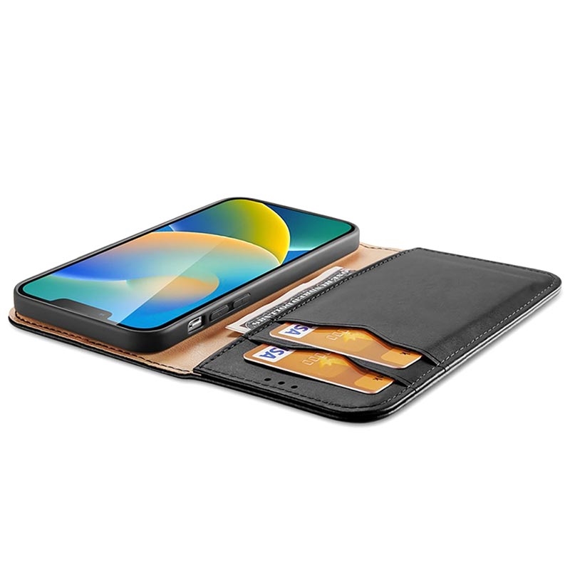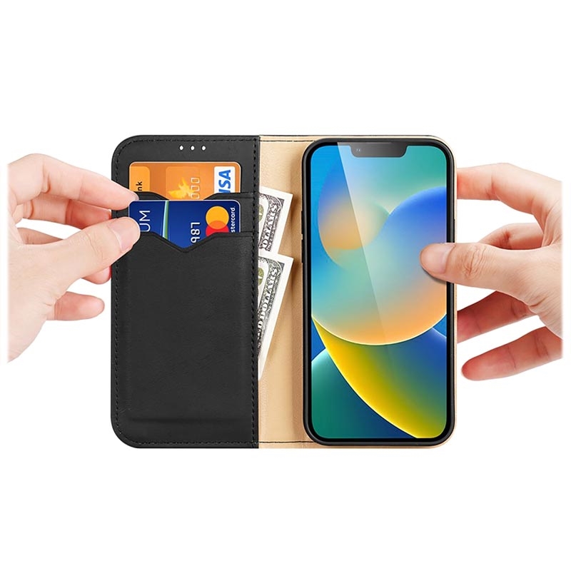 Dette DUX DUCIS etui er lavet af ægte læder, PU læder og TPU. Kortpladsen understøttes af avanceret RFID-blokeringsteknologi til effektivt at blokere signaler og beskytte dine personlige oplysninger mod tyveri.