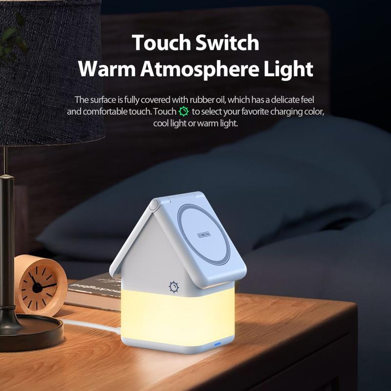 Som ladestation, stander og natlampe. Den kan oplade tre enheder samtidigt, hvilket eliminerer behovet for flere opladere og kabler og reducerer rodetFeather