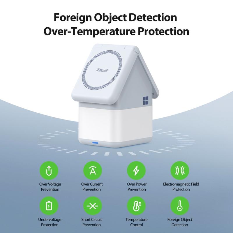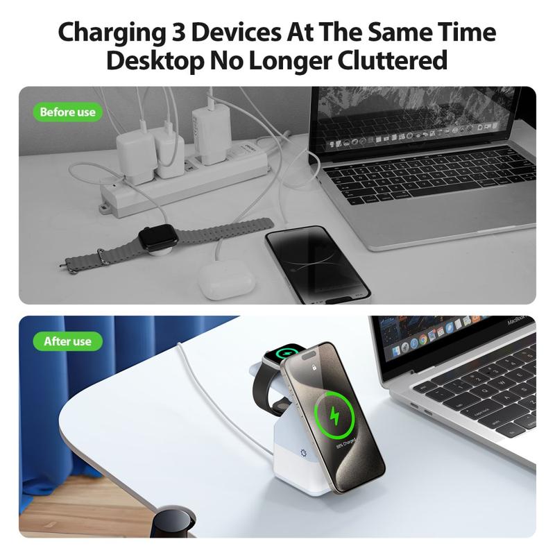 Designet til iPhone 16-serien ned til 12-serien, hvilket muliggør magnetisk opladning. Også kompatibel med Apple Watch Series 1 til 9, inklusive SE- og Ultra-modeller, og med AirPods 2, 3, Pro og Pro 2.